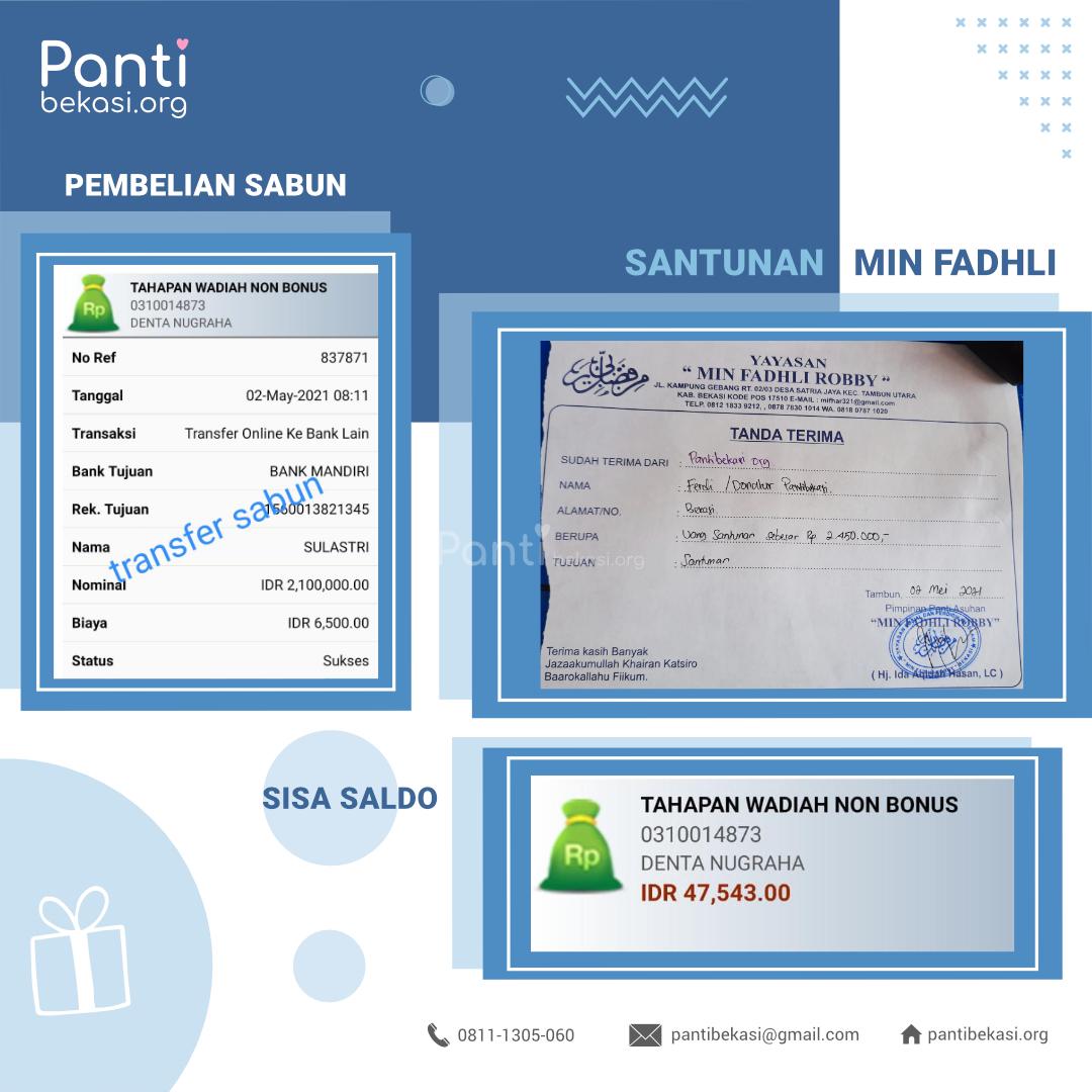 Alhamdulillah Safari Panti bulan Mei 2021 telah kami laksanakan dan berjalan dengan lancar. Terimakasih kepada seluruh donatur yang telah menyisihkan sebagian rezekinya melalui pantibekasi.org.