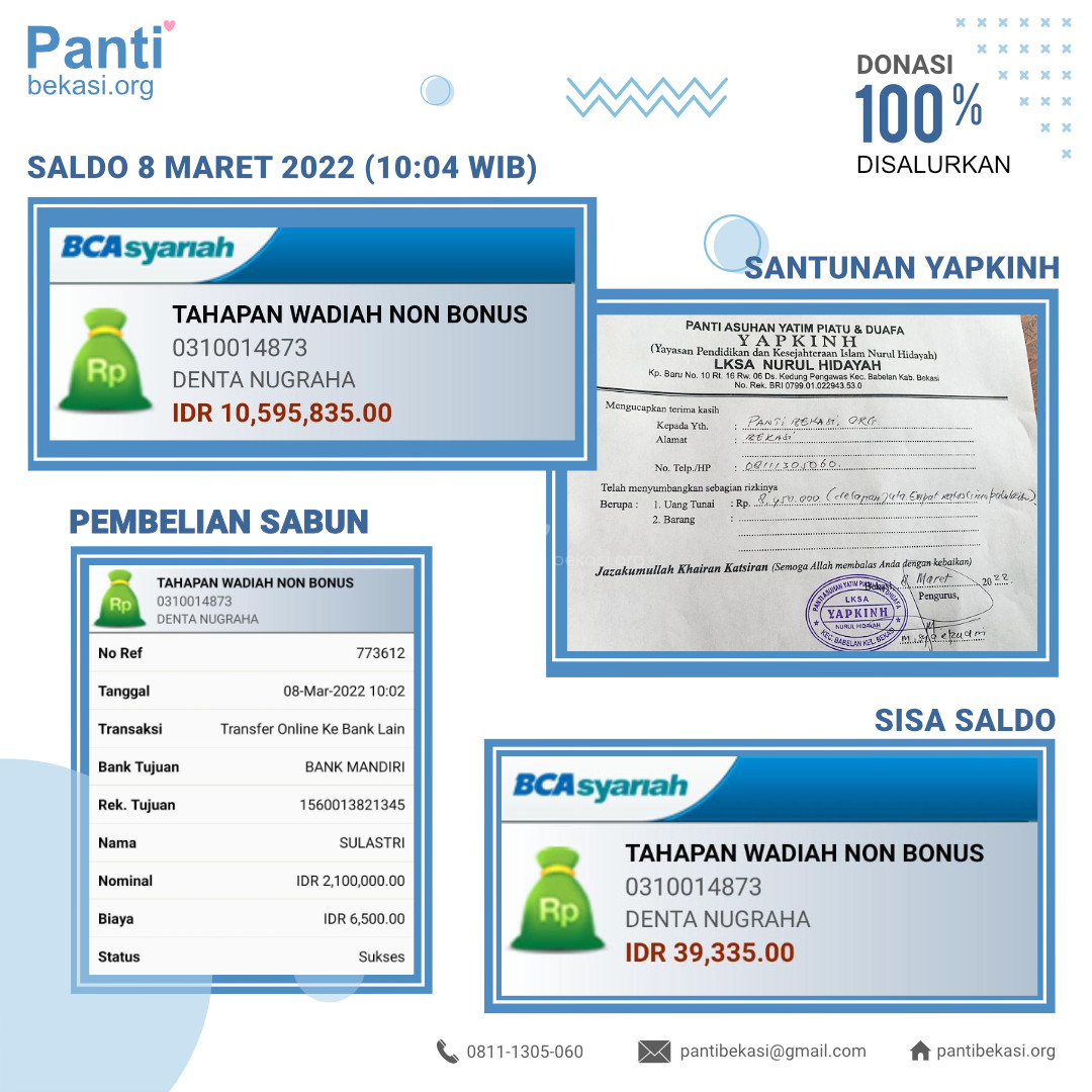 Alhamdulillah Safari Panti bulan Maret 2022 telah kami laksanakan. Alhamdulillah amanah dari kawan-kawan donatur telah kami sampaikan dan berjalan dengan lancar. Terimakasih kepada seluruh donatur yang telah menyisihkan sebagian rezekinya melalui pantibekasi.org.
