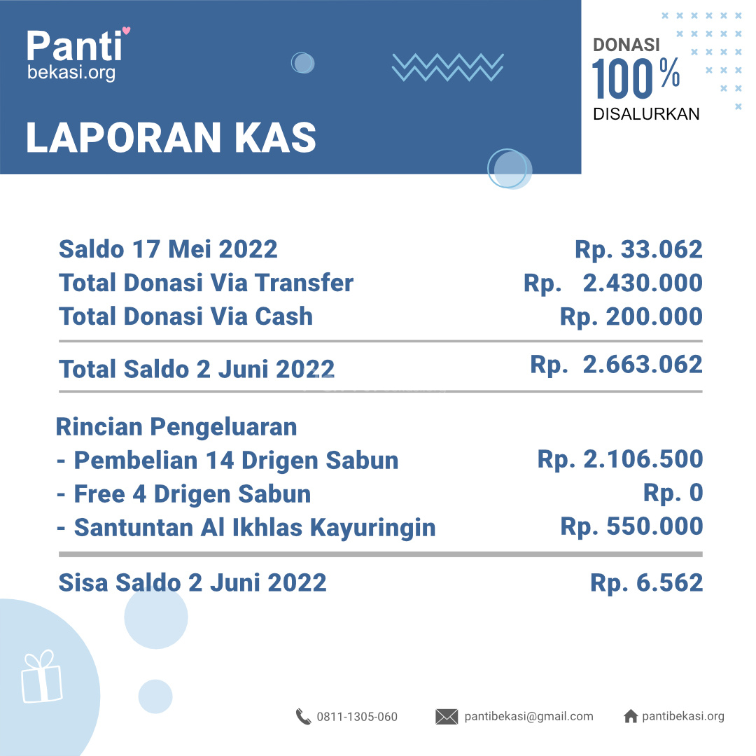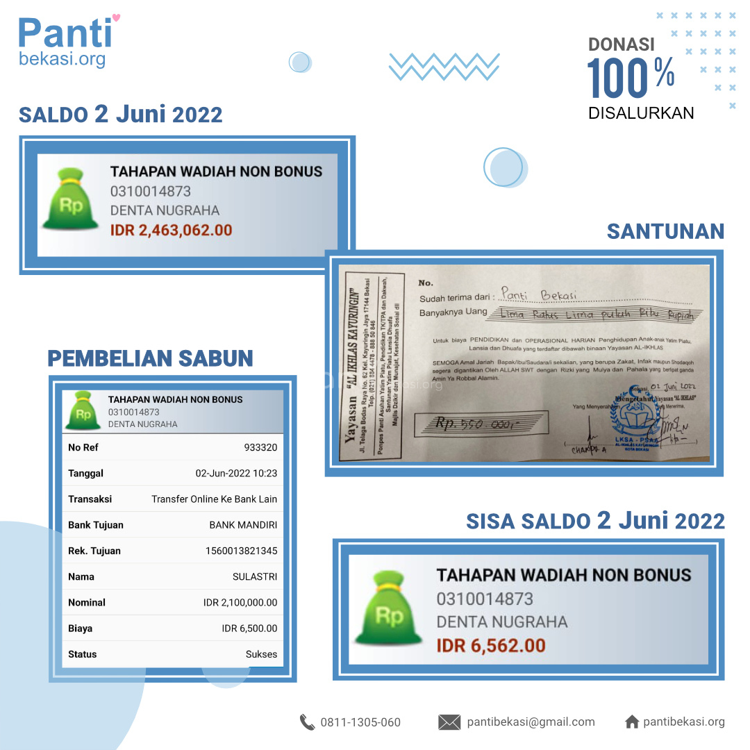Alhamdulillah Safari Panti bulan Juni 2022 telah kami laksanakan. Alhamdulillah amanah dari kawan-kawan donatur telah kami sampaikan dan berjalan dengan lancar. Terimakasih kepada seluruh donatur yang telah menyisihkan sebagian rezekinya melalui pantibekasi.org.