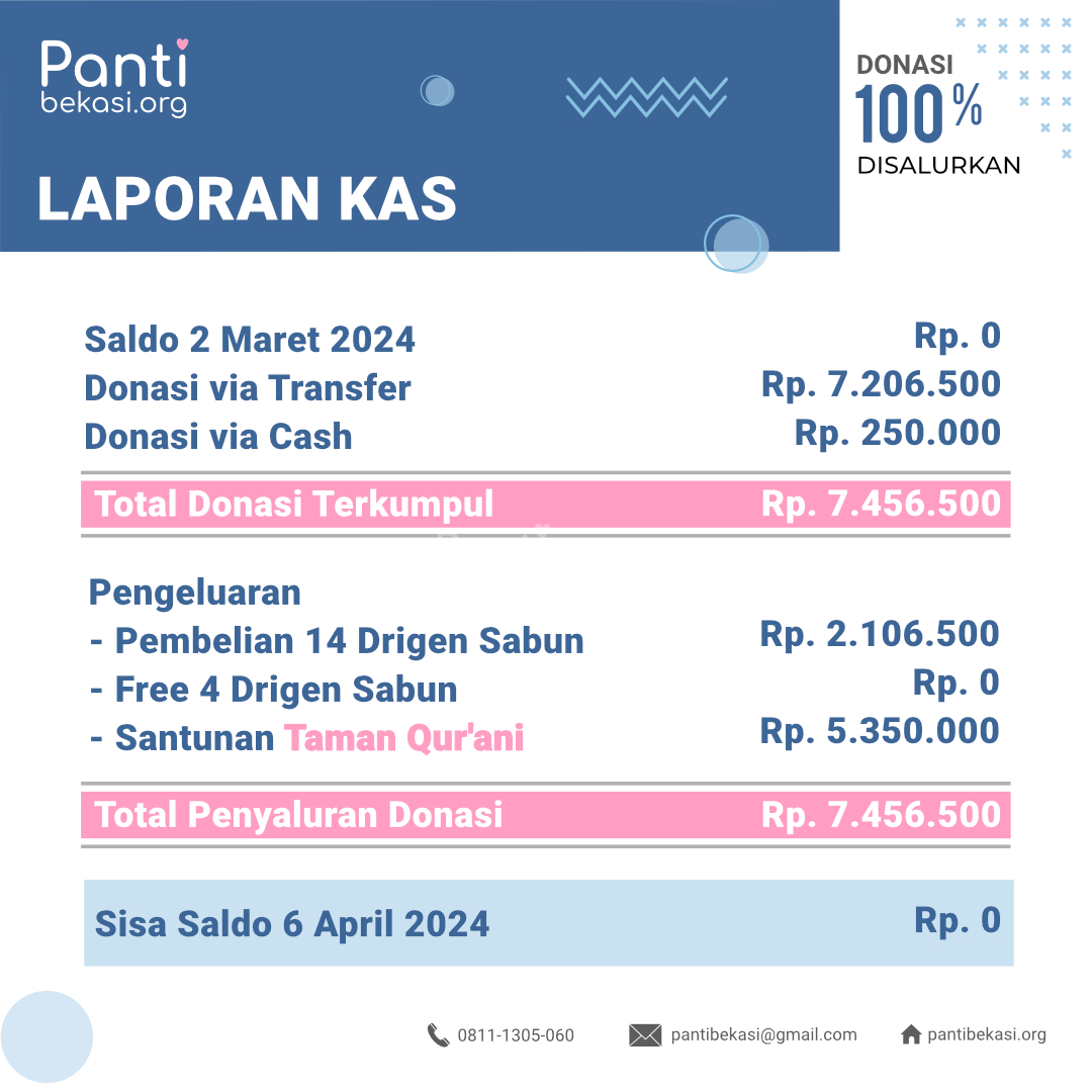 Untuk rincian laporan donasi, dapat dicek melalui Laporan Penerimaan dan Laporan Penyaluran Donasi.