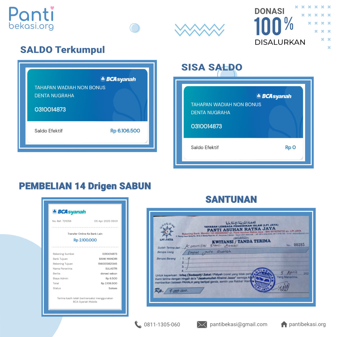 Terimakasih kepada seluruh donatur yang telah menyisihkan sebagian rezekinya melalui pantibekasi.org.